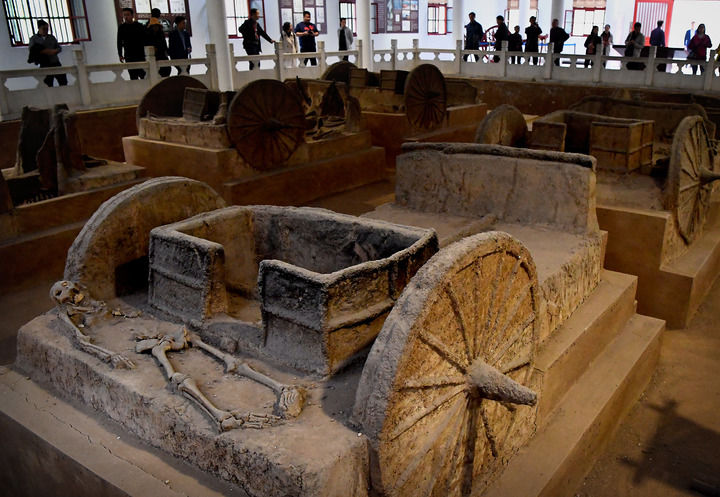 游客在河南安陽殷墟宮殿宗廟遺址內的車馬坑參觀(2018年10月14日攝)。新華社記者 李安 攝
