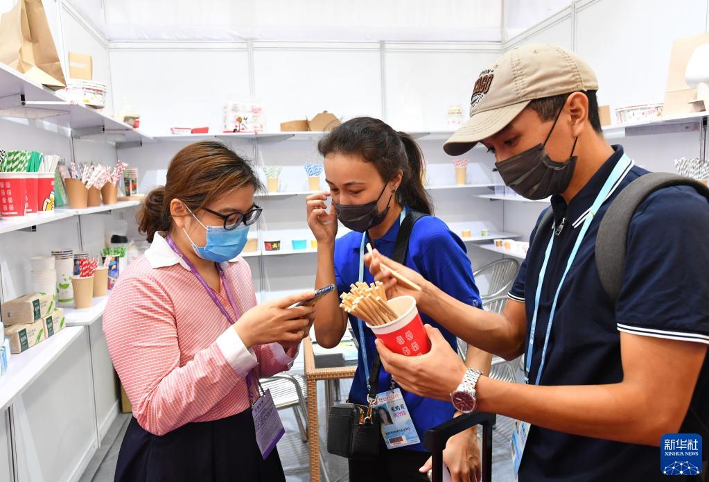 10月15日,在第130屆廣交會(huì)上,來自哈薩克斯坦的采購商在和一家環(huán)保餐具參展商(左)洽談。新華社記者 劉大偉 攝