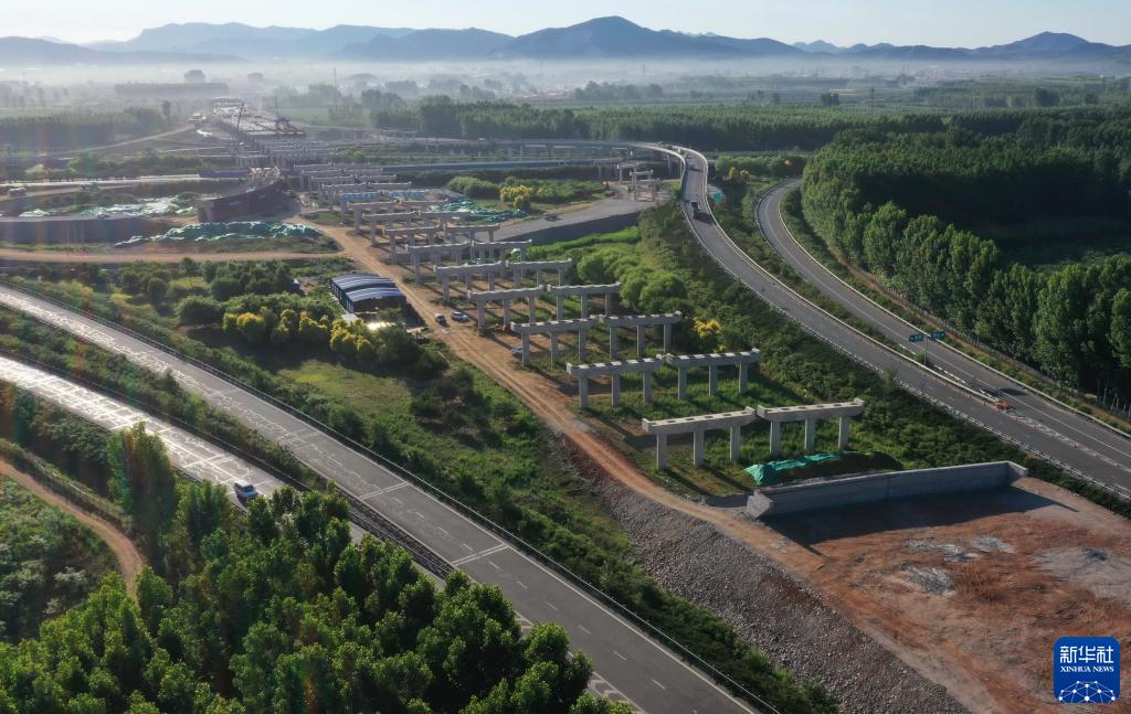 這是6月6日在遵化市境內拍攝的京秦高速公路遵(遵化)秦(秦皇島)段與唐(唐山)承(承德)高速下院寺樞紐互通建設工地(無人機照片)。新華社記者 楊世堯 攝