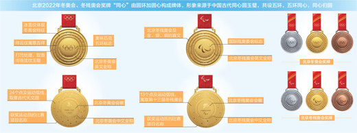 北京冬奧會獎牌“同心”由圓環加圓心構成牌體,創意來源于中國古代同心圓玉璧,共設五環,寓意五環同心,同心歸圓,表達了“天地合、人心同”的中華文化內涵,也象征著奧林匹克精神將人們凝聚在一起,冬奧榮光、全球共享。