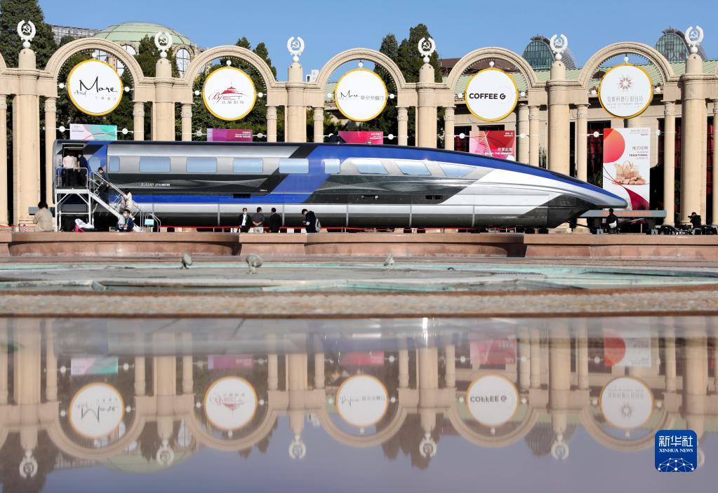 10月21日,觀(guān)眾在北京展覽館參觀(guān)國(guó)家“十三五”科技創(chuàng)新成就展展出的時(shí)速600公里的高速磁浮列車(chē)。新華社記者 金立旺 攝