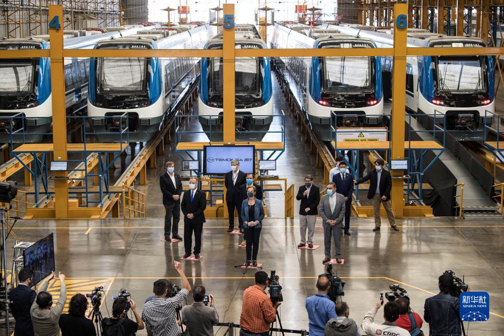 3月23日,智利交通和電信部長烏特(中)在首都圣地亞哥參觀中國軌道列車,稱贊這批車輛的到來是近年來智利“鐵路發展最重要的里程碑之一”。新華社發(豪爾赫·比列加斯攝)