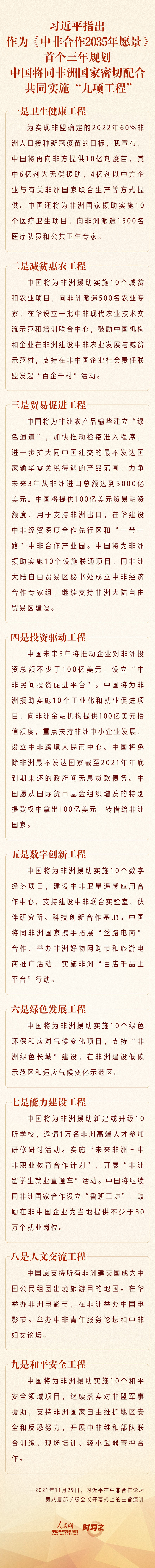 11月29日晚,國家主席習(xí)近平在北京以視頻方式出席中非合作論壇第八屆部長級會議開幕式并發(fā)表主旨演講。習(xí)近平就構(gòu)建新時代中非命運共同體提出4點主張,并指出,作為《中非合作2035年愿景》首個三年規(guī)劃,中國將同非洲國家密切配合,共同實施“九項工程”。