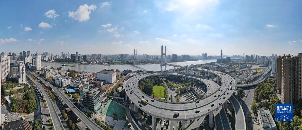 12月1日拍攝的上海南浦大橋(無(wú)人機(jī)全景照片)。