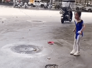 發(fā)現(xiàn)國旗掉落在地,小女孩趕緊跑過去,小心翼翼地彎腰撿起。