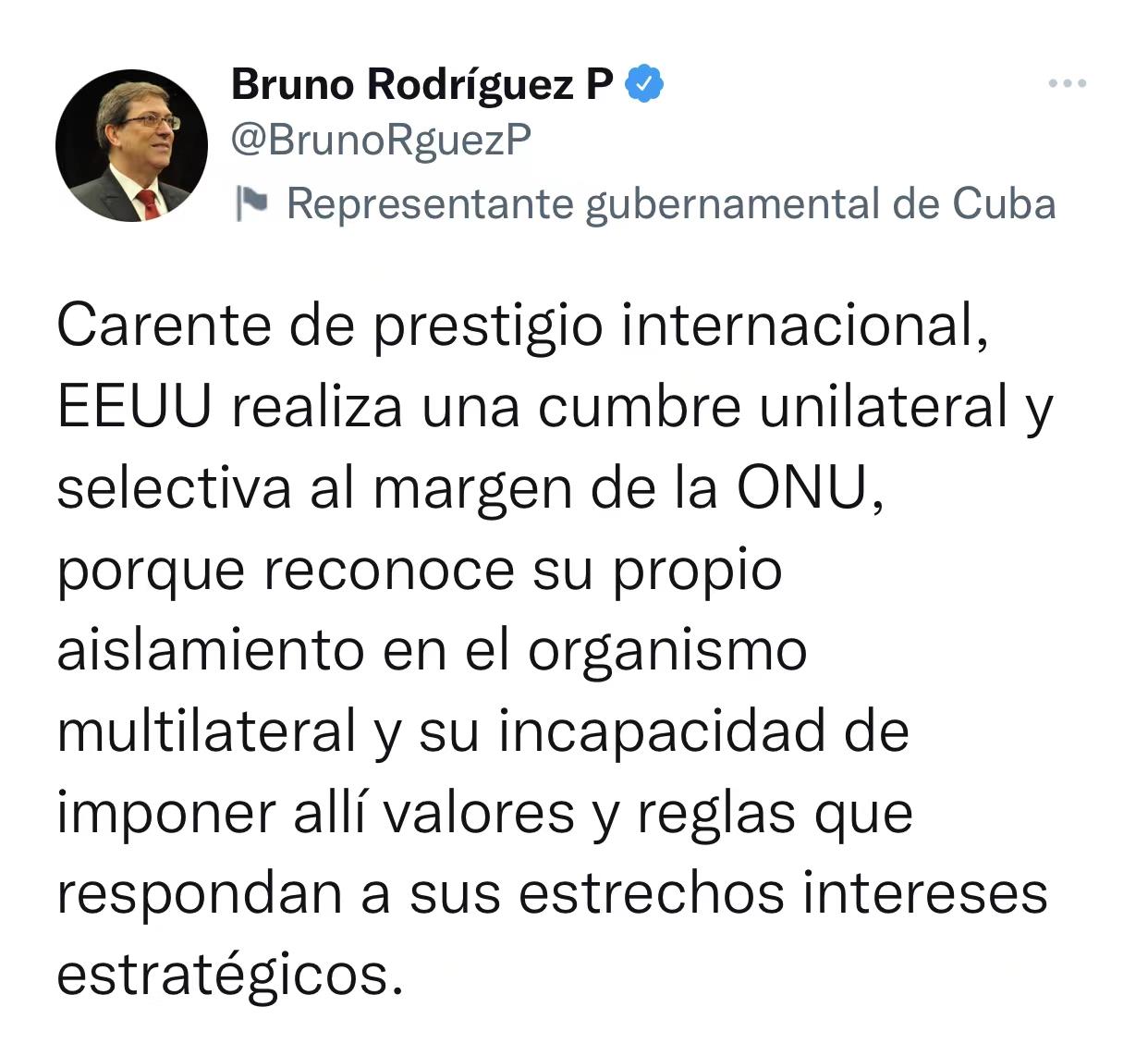 古巴外交部長(zhǎng)布魯諾·羅德里格斯表示,美國(guó)在聯(lián)合國(guó)框架外舉行單邊的、有選擇性的峰會(huì),是因?yàn)槊绹?guó)認(rèn)識(shí)到自身在多邊組織中處于孤立狀態(tài),無(wú)法在多邊組織中向別國(guó)強(qiáng)加“符合其自身狹隘戰(zhàn)略利益的價(jià)值觀和規(guī)則”。