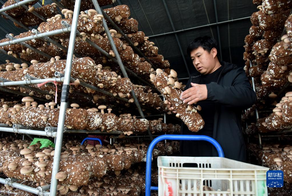 12月21日,張亞濤在香菇大棚內采摘香菇。