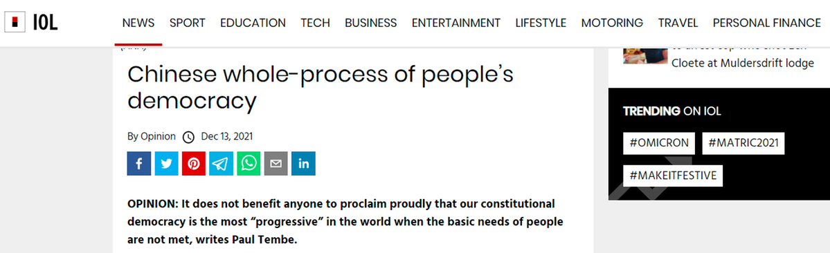 南非大學姆貝基非洲領導力研究院高級研究員譚哲理(Paul Tembe)在南非獨立在線新聞網站(IOL)發表評論文章,積極評價中國的全過程人民民主,認為中國的民主制度實現了良政善治,南非可以從中學習借鑒以更好服務本國人民。