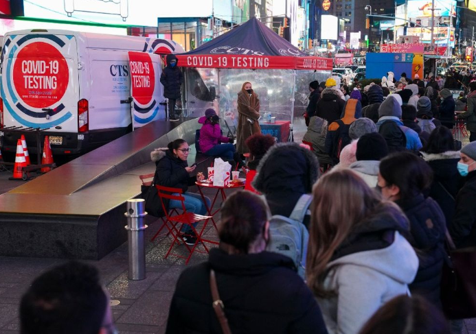 △12月20日,人們在美國紐約時報廣場排隊等待進行核酸檢測。