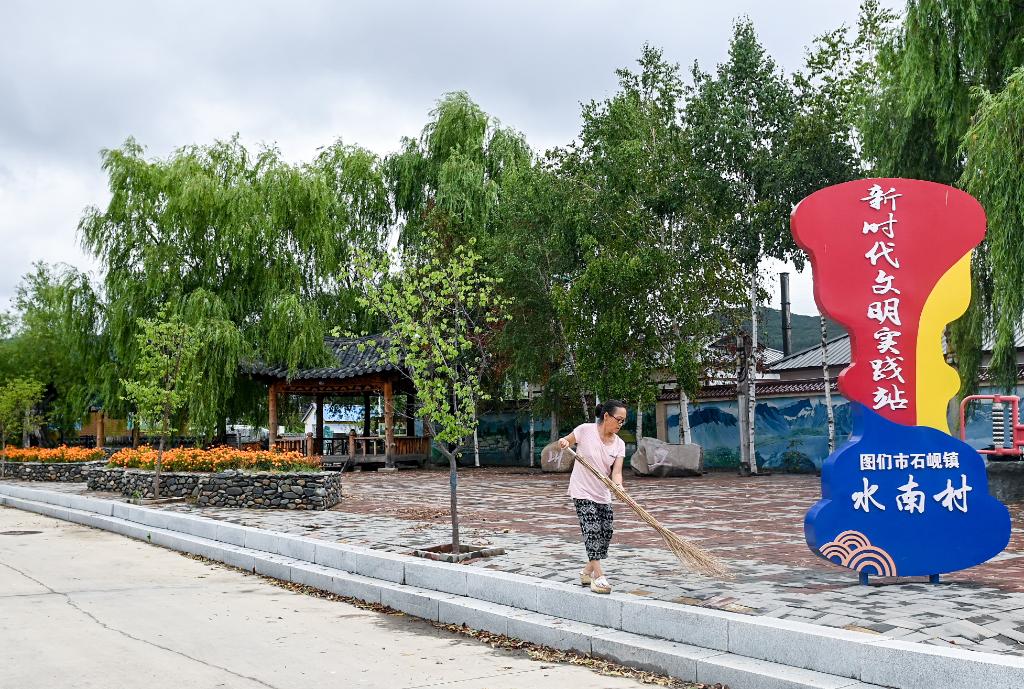 圖們市石峴鎮水南村村民在村子里的小廣場上打掃衛生。(2021年8月3日)。新華社記者顏麟蘊攝