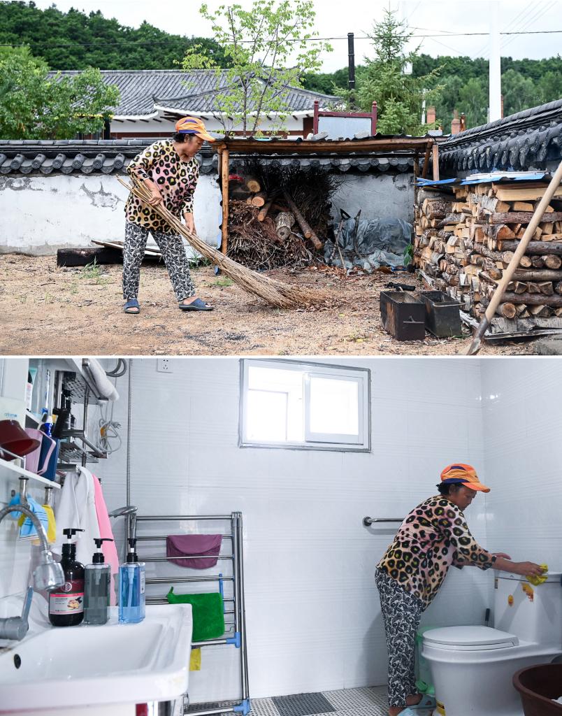 上圖為圖們市石峴鎮水南村村民康順姬在打掃院子里的旱廁舊址;下圖為康順姬打掃室內水沖廁所(2021年8月3日攝)。新華社記者顏麟蘊攝