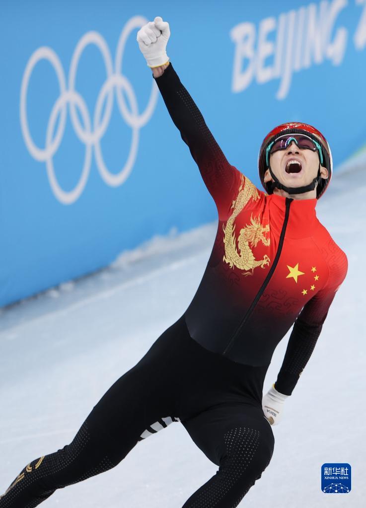 2月5日,中國(guó)隊(duì)選手武大靖在比賽后慶祝。