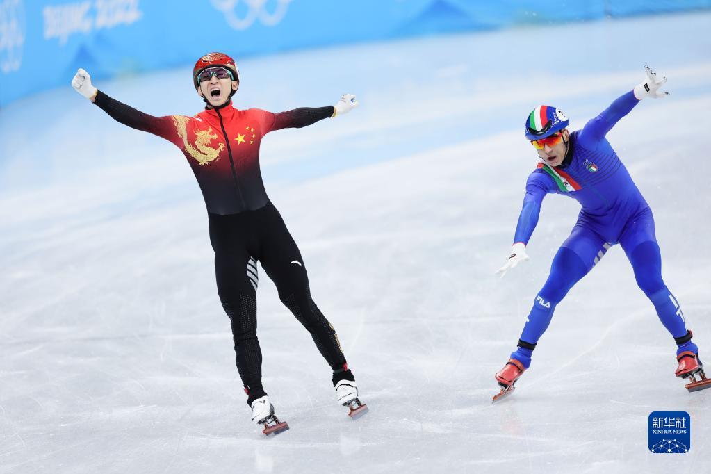 2月5日,中國(guó)隊(duì)選手武大靖(左)在比賽后慶祝。