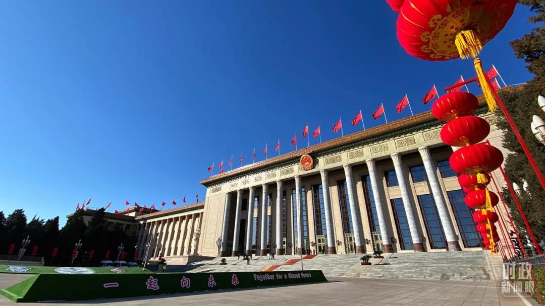 △人民大會堂外,為迎接冬奧新設計的“一起向未來”字樣格外醒目。(總臺央視記者石奇用拍攝)