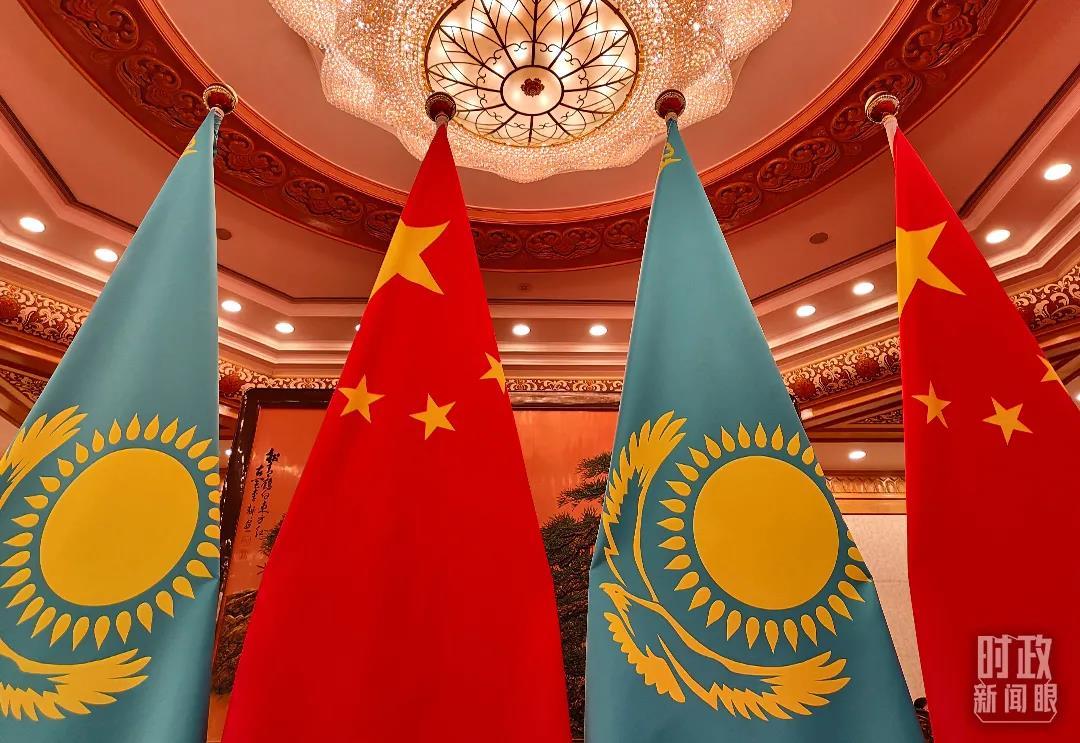 △2月5日上午,會談現場擺放的中哈兩國國旗。(總臺央視記者楊立峰拍攝)
