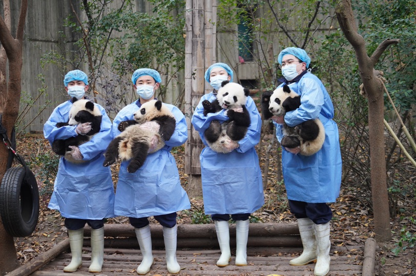 成都大熊貓繁育研究基地2021級熊貓寶寶通過網絡“云亮相”的方式,慶祝北京冬奧會圓滿舉行。 (成都大熊貓繁育研究基地供圖)