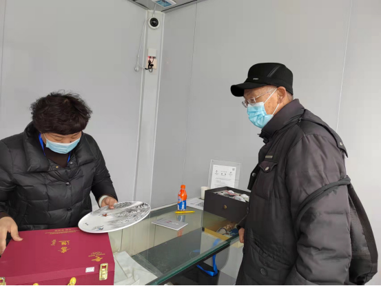 圖為游客買(mǎi)到心儀的冬奧特許商品后,工作人員把商品裝入精美的包裝盒。中工網(wǎng)記者 劉云攝