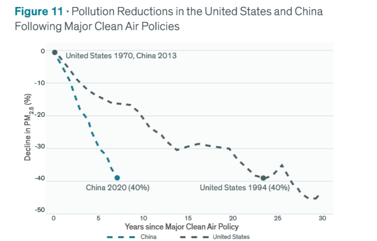 芝加哥大學(xué)的報(bào)告還對比了中美治理大氣污染所需的時(shí)間。《報(bào)告》顯示,美國從20世紀(jì)70年代初開始著手應(yīng)對污染問題,經(jīng)歷了幾十年的時(shí)間和數(shù)次經(jīng)濟(jì)衰退才實(shí)現(xiàn)了中國在七年內(nèi)完成的污染減少總量。