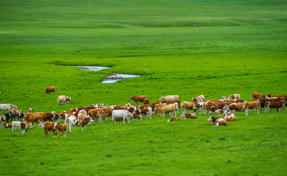 ↑2021年7月15日,牛群在內蒙古錫林郭勒盟東烏珠穆沁旗的草原上覓食。