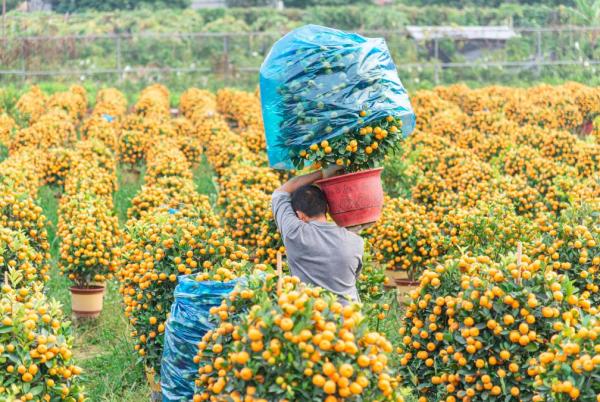 △2022年1月21日,廣州南沙區魚窩頭細瀝村的農田上種植了大量年橘盆栽,枝頭上掛滿了果實,正在現場出售中。