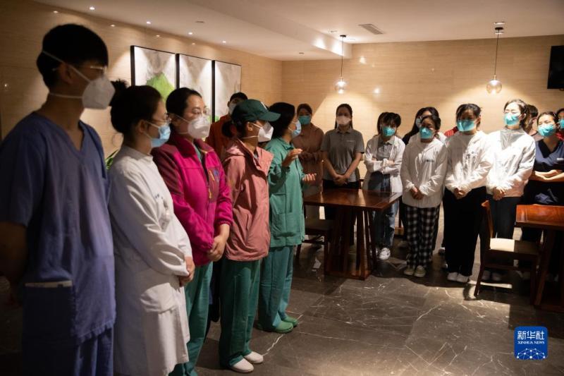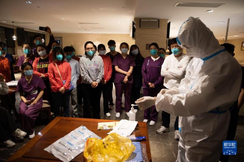 4月28日,在上海浦東北蔡鎮一家酒店,東方醫院南院醫護人員和下午抵達的杭州口腔醫院援滬醫療隊隊員交流核酸采樣注意事項。