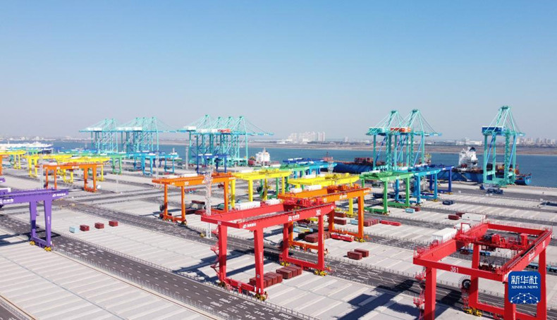 這是天津港北疆港區C段智能化集裝箱碼頭(2021年10月17日攝,無人機照片)。新華社記者 趙子碩 攝