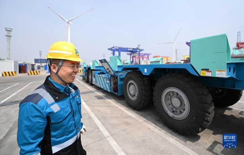 在天津港北疆港區C段智能化集裝箱碼頭,全國勞動模范成衛東參觀“水平運輸機器人”(4月29日攝)。新華社記者 李然 攝