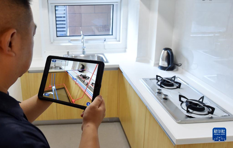 在中新天津生態城一小區,小區業主通過AR房屋使用說明書查看廚房管道線路(2020年8月13日攝)。新華社記者 趙子碩 攝
