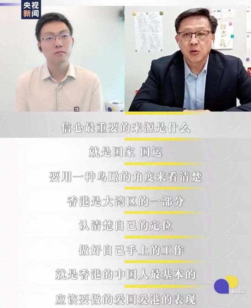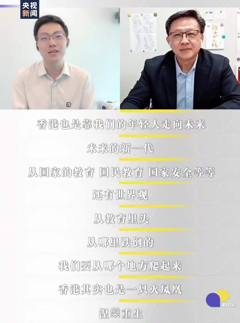 何君堯:這是一個過程,香港也要靠我們的年輕人走向未來。對于未來的新一代,我們要抓好國民教育、國家安全教育、世界觀教育等等。從哪里跌倒的,就要從哪個地方爬起來。今天的香港,就像一只火鳳凰,在烈火當中,涅槃重生。