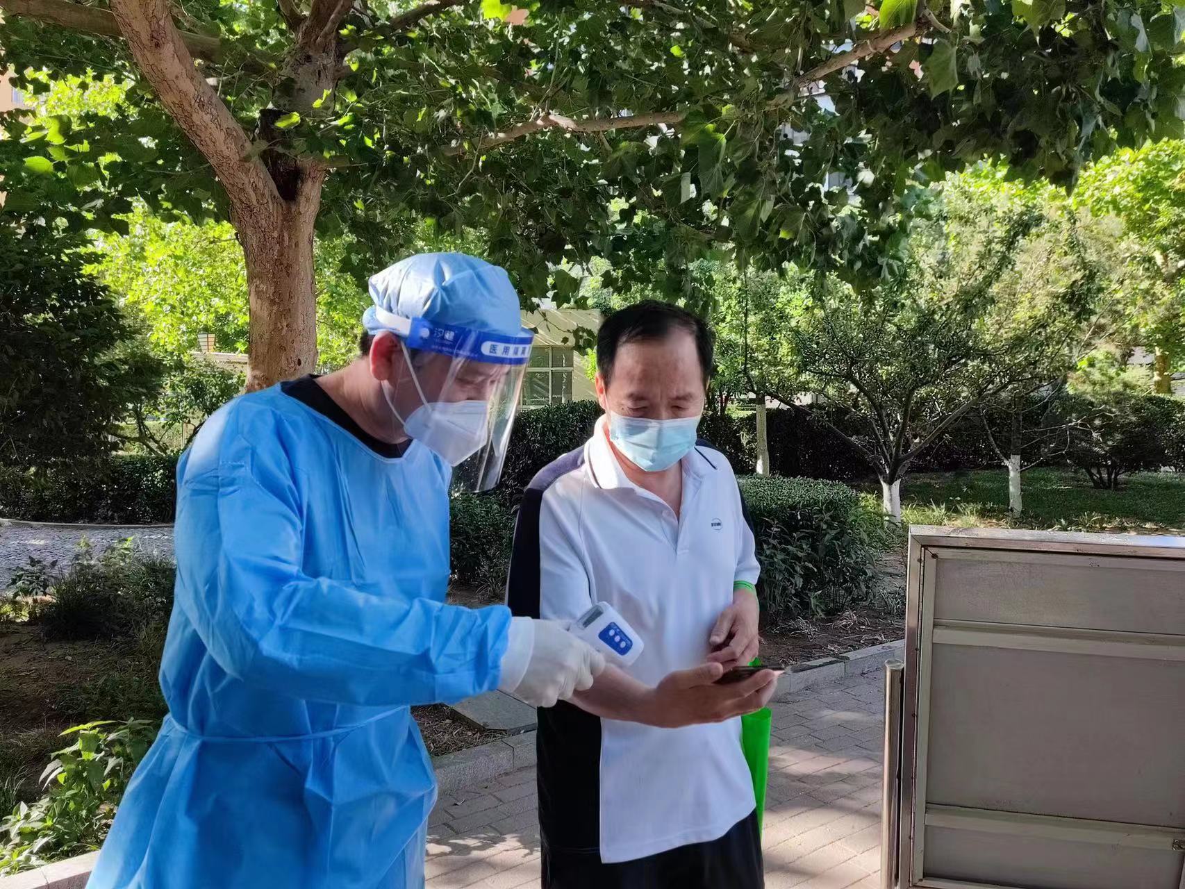 楊志強(qiáng)為社區(qū)居民測(cè)體溫