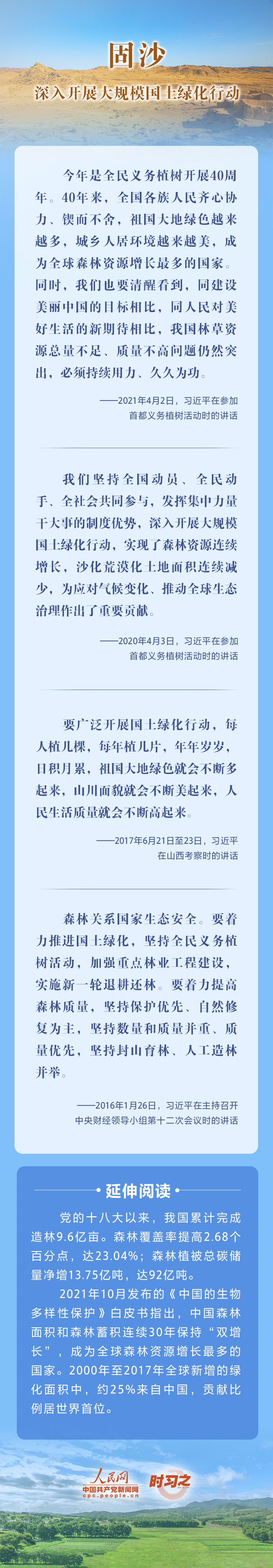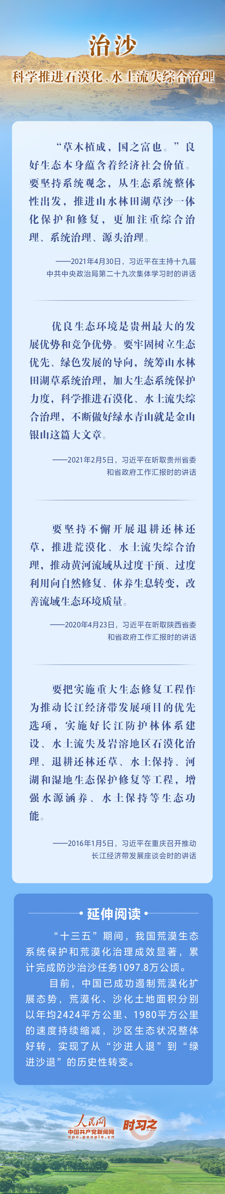 2022年6月17日是第二十八個世界防治荒漠化與干旱日。荒漠化是全球面臨的重大生態(tài)問題,黨的十八大以來,在習(xí)近平生態(tài)文明思想的指引下,我國荒漠化防治工作開辟了新境界、邁上了新臺階。讓我們一起從總書記的重要論述里學(xué)習(xí)領(lǐng)悟中國踐行綠色發(fā)展理念,堅定走好荒漠化防治之路的決心。