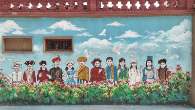 △當地的文化墻繪上,專門呈現了新城西門村和十八洞村元素。(總臺記者曹江拍攝)