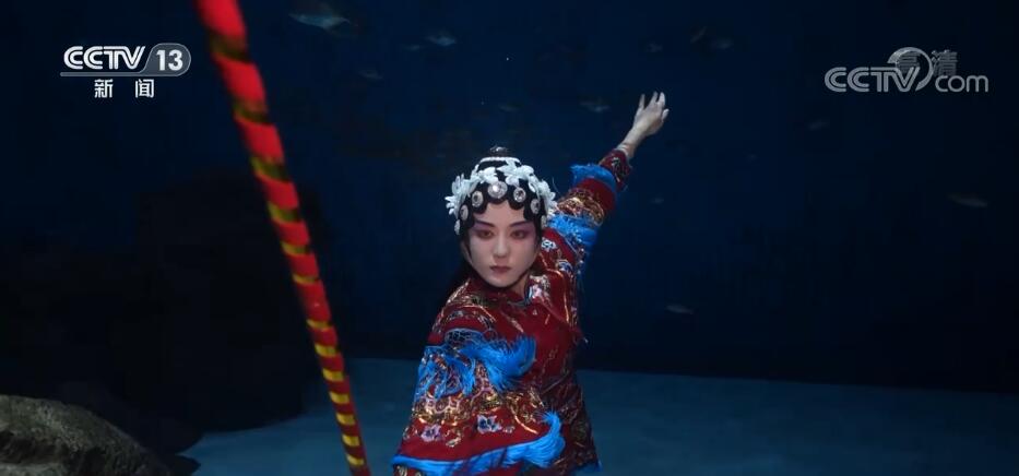 在上海海昌海洋公園,專業的水下演員身著傳統戲曲服飾,正在上演一出精彩的國潮水下刀馬旦,讓游客領略到別樣的國粹之美。