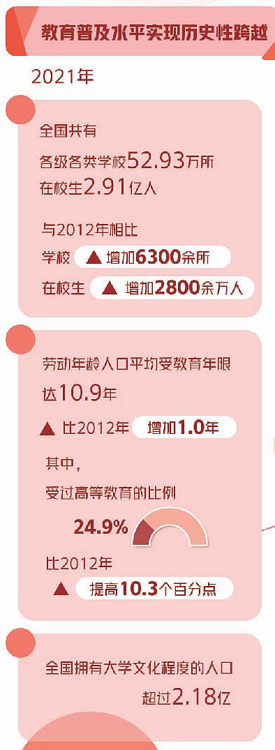 教育是國之大計、黨之大計。黨的十八大以來,在以習近平同志為核心的黨中央堅強領導下,我國教育事業取得歷史性成就。從教育部公布的一組數據可以明顯看出,10年來,我國教育普及水平不斷提高,國民受教育機會進一步擴大,受教育程度也得到了進一步提升。2021年,勞動年齡人口平均受教育年限達10.9年,比2012年增加了1年。