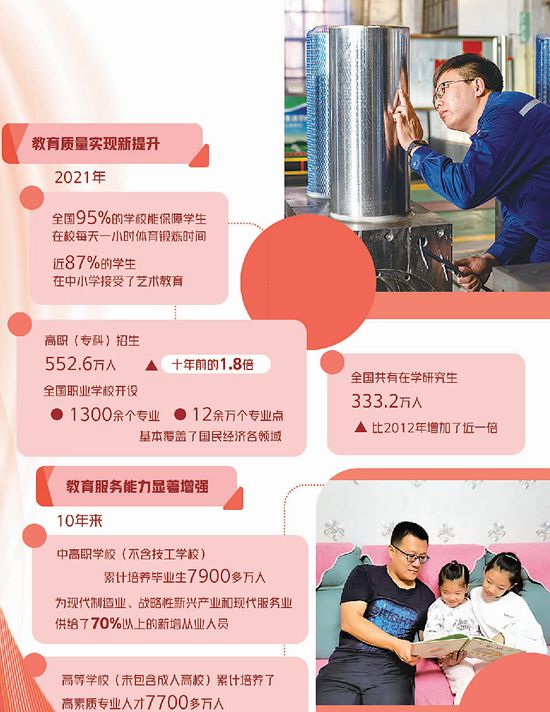 這10年,教育系統踐行以人民為中心的發展思想,教育發展成果更多更公平惠及全體人民。義務教育階段建檔立卡輟學學生實現動態清零;在義務教育全面普及的基礎上,全國2895個縣全部實現義務教育基本均衡;普惠性幼兒園更多了,2021年全國有普惠性幼兒園24.5萬所,占幼兒園總量的83%,其中有一半是公辦園;中西部和農村地區孩子上好大學的機會更多了,國家支持中西部地區招生協作計劃得以實施,每年從全國招生計劃增量中專門安排部分名額面向中西部地區和考生大省招生;農村孩子的個頭更高了,農村義務教育學生營養改善計劃實施地區的男生、女生平均身高比2012年分別增高了4.2厘米和4.1厘米……