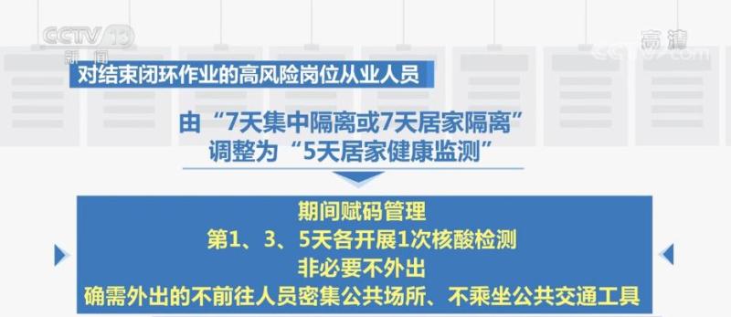 對結束閉環作業的高風險崗位從業人員由“7天集中隔離或7天居家隔離”調整為“5天居家健康監測”,期間賦碼管理,第1、3、5天各開展1次核酸檢測,非必要不外出,確需外出的不前往人員密集公共場所、不乘坐公共交通工具。