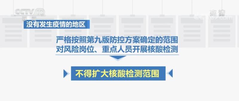 沒有發生疫情的地區嚴格按照第九版防控方案確定的范圍對風險崗位、重點人員開展核酸檢測,不得擴大核酸檢測范圍。一般不按行政區域開展全員核酸檢測,只在感染來源和傳播鏈條不清、社區傳播時間較長等疫情底數不清時開展。制定規范核酸檢測的具體實施辦法,重申和細化有關要求,糾正“一天兩檢”“一天三檢”等不科學做法。