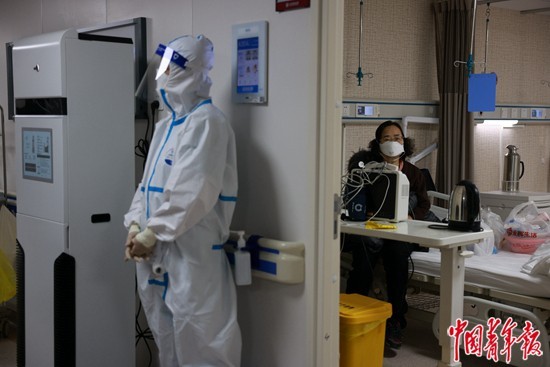 12月27日,北京朝陽醫院發熱門診留觀病房,一名病情趨于平穩的新冠重癥患者準備轉移到其他病房,一名醫護人員在門外時刻待命。每騰空一張病床,就意味著多一名患者能獲得治療的機會。