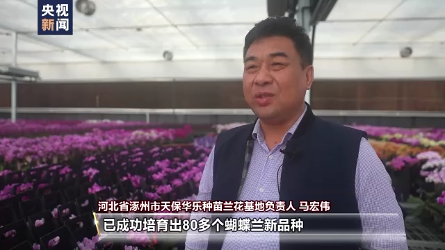 河北省涿州市天保華樂種苗蘭花基地負(fù)責(zé)人 馬宏偉:我們的種苗基地已成功培育出80多個蝴蝶蘭新品種,年出口種苗達(dá)到6000萬株,銷售成品蝴蝶蘭20余萬株,年產(chǎn)值超千萬元。