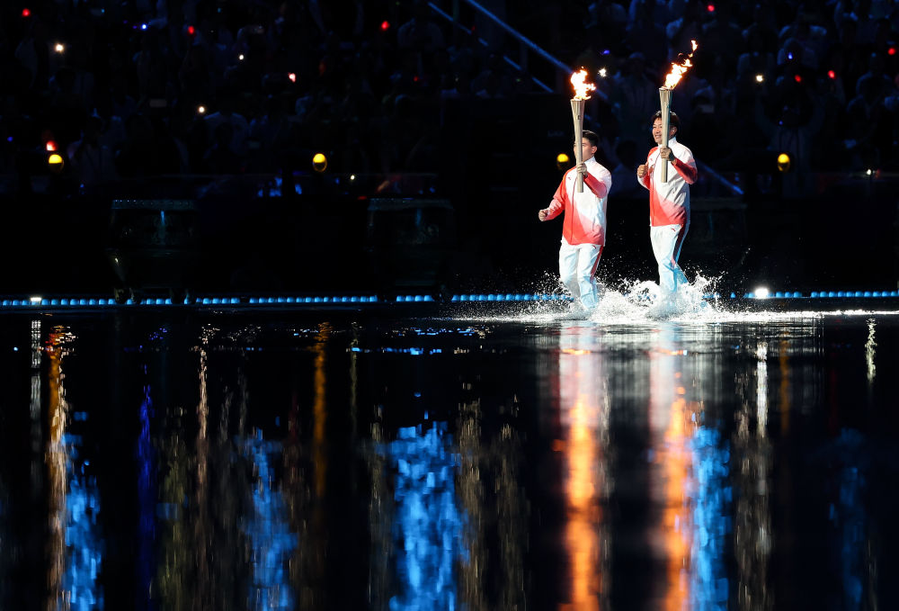 火炬手跑向主火炬臺。新華社記者肖藝九攝