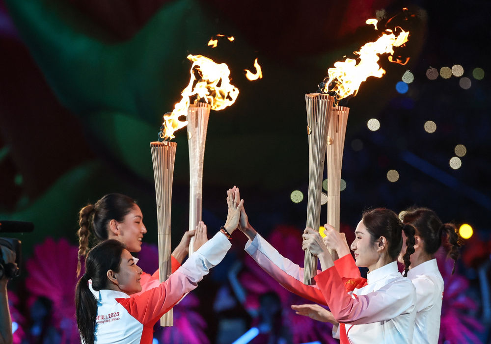 旗手護送中華人民共和國運動會會旗和第十五屆全國運動會會旗入場。新華社記者盧漢欣攝