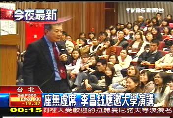 據臺TVBS電視臺報道,李昌鈺昨晚的演講現場座無虛席、整場爆滿。從求學經歷講到對國際刑案的剖析,李昌鈺讓師生們聽得津津有味。