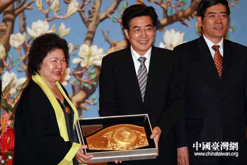 北京市長郭金龍今天在北京飯店會見了率團來訪的高雄市長陳菊。圖為郭金龍向陳菊贈送“鳥巢模型”。(中國臺灣網 田云鵬 攝) 第1頁第2頁第3頁第4頁第5頁