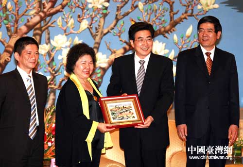北京市長郭金龍今天在北京飯店會見了率團(tuán)來訪的高雄市長陳菊。圖為陳菊向郭金龍贈送精美禮品。(中國臺灣網(wǎng) 田云鵬 攝)