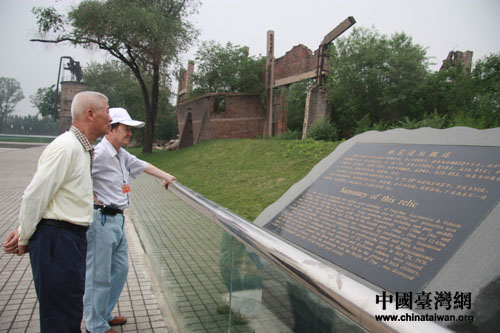 參加“第四屆海峽兩岸企業發展與合作論壇”的兩位老臺胞在唐山地址遺址前參觀。(中國臺灣網 肖燕 攝)