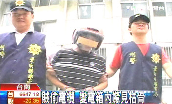 中國臺灣網7月3日消息 據臺灣TVBS電視臺報道,臺南縣一名小偷潛入歇業的工廠偷電纜,意外發現變電器箱里竟有一具白骨。據臺灣警察分析,死者可能是要偷電纜意外觸電,死亡時間超過2年;發現白骨的竊賊,也因為留在現場,通緝犯身份曝光,被帶回警局。