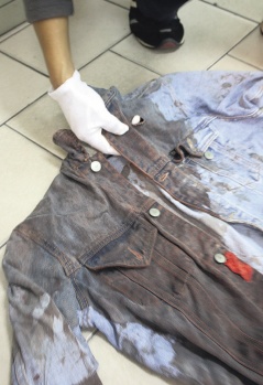 李忠財狠心殺害前妻周錦惠,當時她穿的牛仔衣一片血跡,上衣左胸可清楚看見被刺一個大洞。(圖片來源:臺灣《聯合報》)