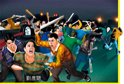 劉育榤隨即通知“阿淇”動(dòng)員10多輛車(chē)、約30人赴約。林佑渝則找來(lái)自認(rèn)講義氣的死者劉彥聰?shù)人娜耍殖藘奢v車(chē)抵達(dá),但見(jiàn)對(duì)方人手眾多想逃跑。林佑渝和傅姓少年所乘的車(chē)子因被路口玉米攤擋住難以脫身,傅姓少年當(dāng)場(chǎng)被打倒倒地,林則被砍傷逃入路旁稻田躲藏,事后住戶(hù)聽(tīng)到求救聲,才將林佑渝、傅姓少年送醫(yī)。