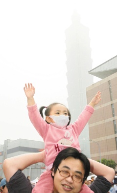 臺(tái)北101大樓籠罩在沙塵之中,家長(zhǎng)為小朋友戴上口罩。圖片來(lái)源:臺(tái)灣《聯(lián)合報(bào)》