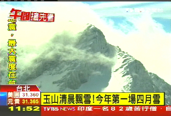 玉山氣象站技士康明山指出,2000年玉山曾下過一場“5月雪”,最近10年4、5月份下雪則相當(dāng)罕見。玉山去年4月16、17日清晨也曾短暫飄降“4月雪”,但到近午時分積雪即完全融化。